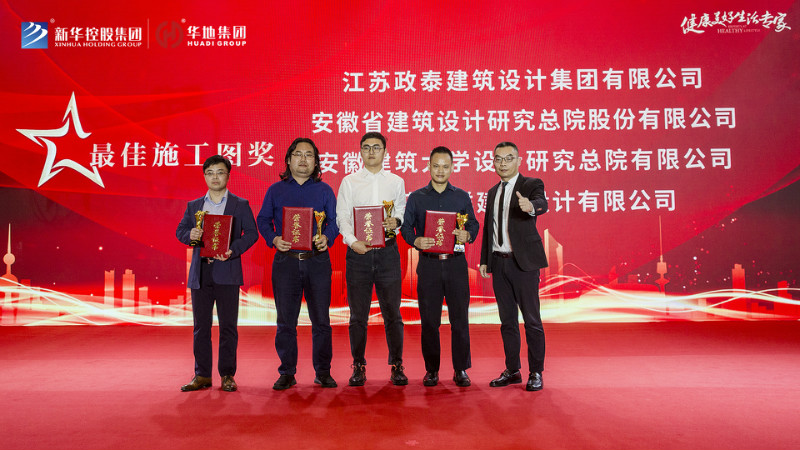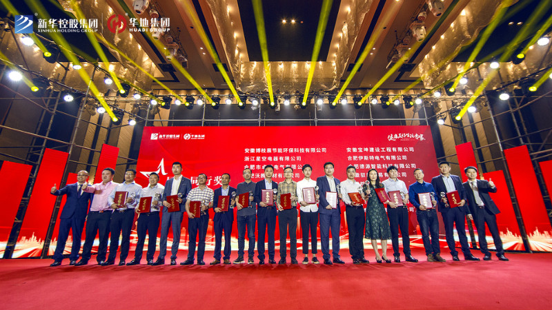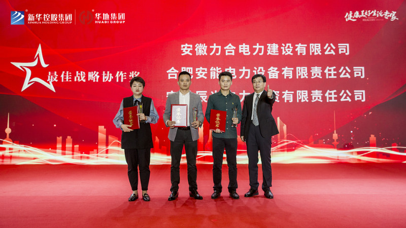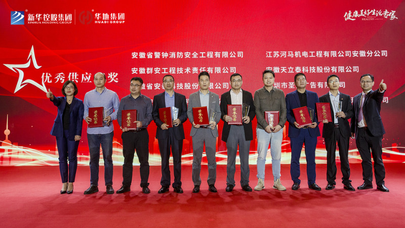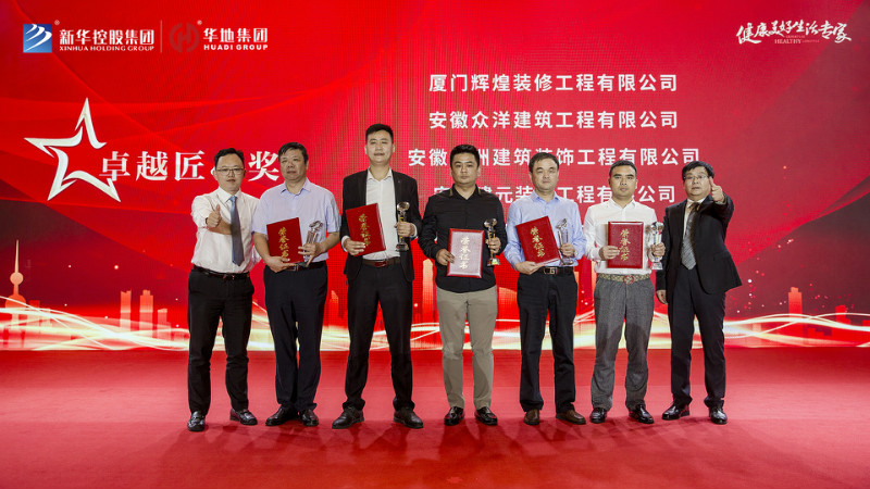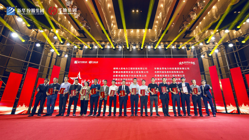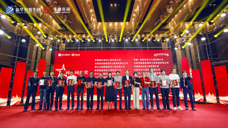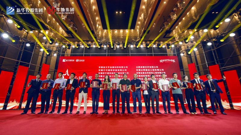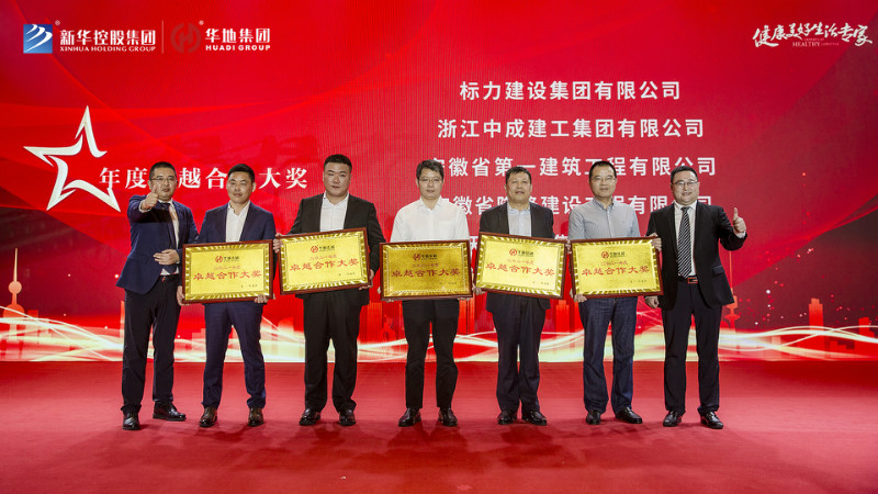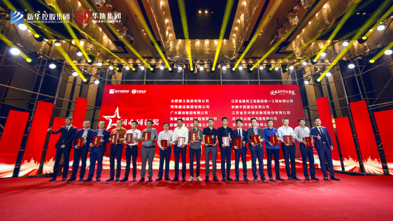 最后新華控股集團副總裁兼華地集團執行總裁吳守狀先生、 新華控股集團副總裁兼華地中安總經理黃傳偉先生共同為標力建設集團有限公司、安徽省隆峰建設工程有限公司、浙江中成建工集團有限公司、天元建設集團有限公司、安徽省第一建筑工程有限公司頒發“年度卓越合作大獎”,將本次盛典氣氛推向高潮。