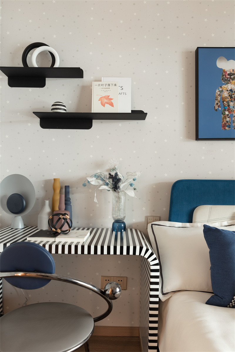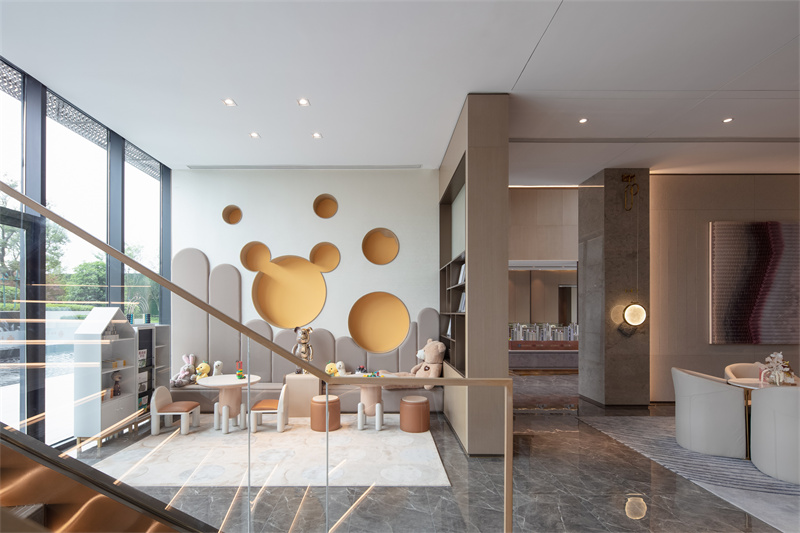 低飽和度的色彩搭配,點綴以明亮的黃色與橙色,整體空間充滿活力與童趣。這個靜處一隅的兒童閱讀區,緊鄰洽談區與樣板間,讓生活的美好在這一刻就被感知。