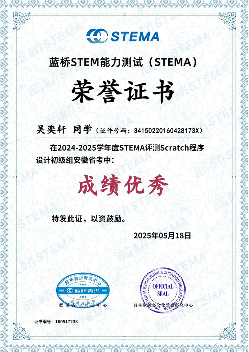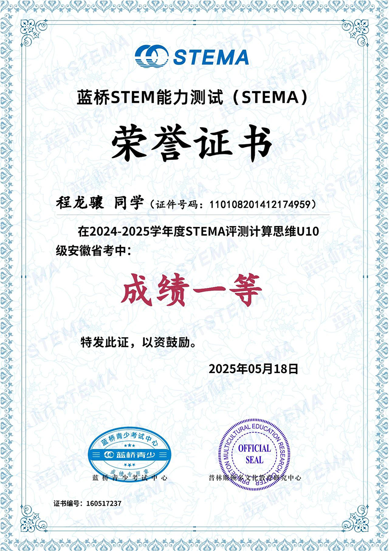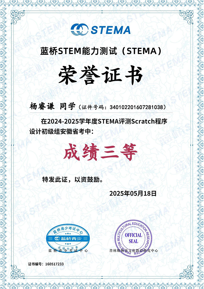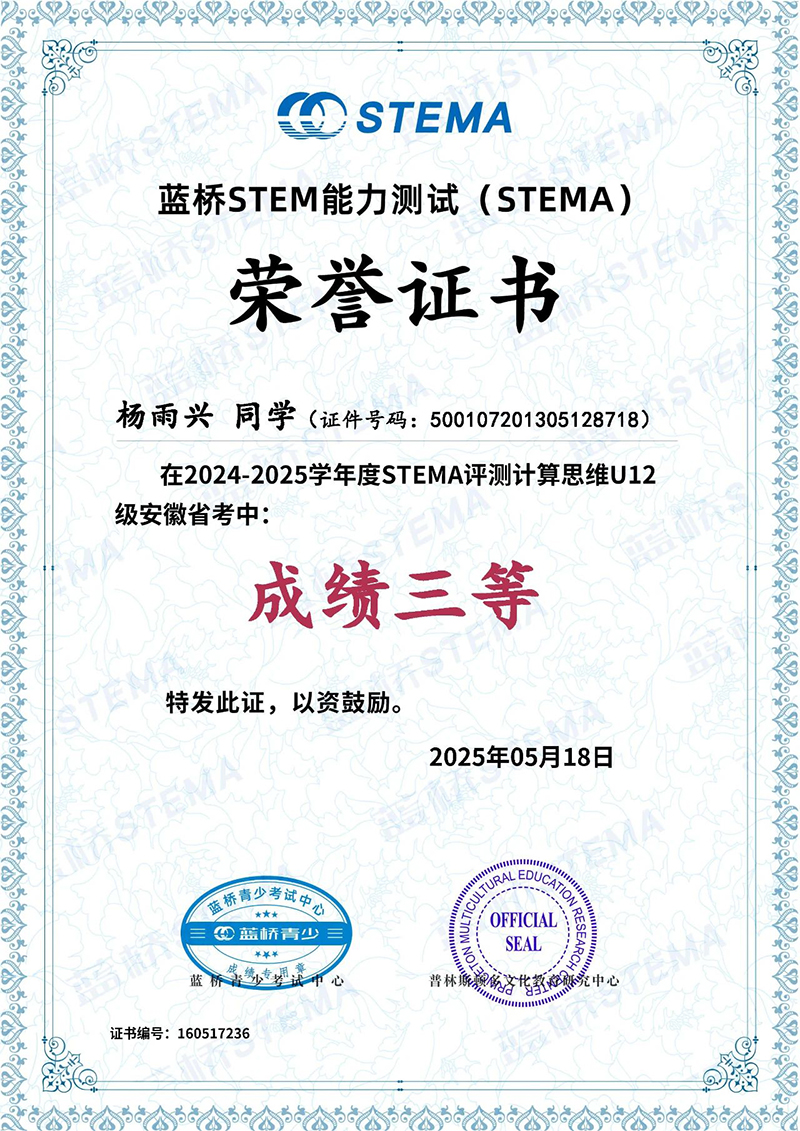 近日,藍(lán)橋STEMA安徽省考成績(jī)揭曉,我校多名學(xué)子在此次測(cè)評(píng)中脫穎而出、斬獲佳績(jī),為學(xué)校爭(zhēng)得了榮譽(yù)。向所有獲獎(jiǎng)同學(xué)致以最熱烈的祝賀!?