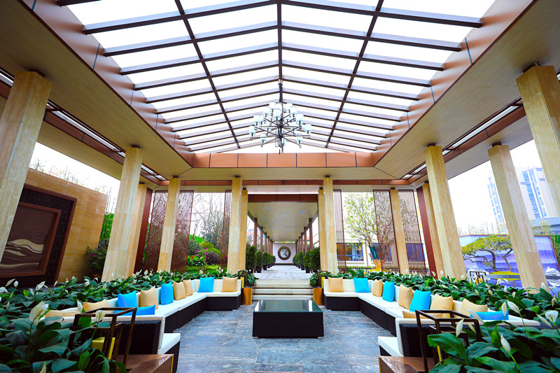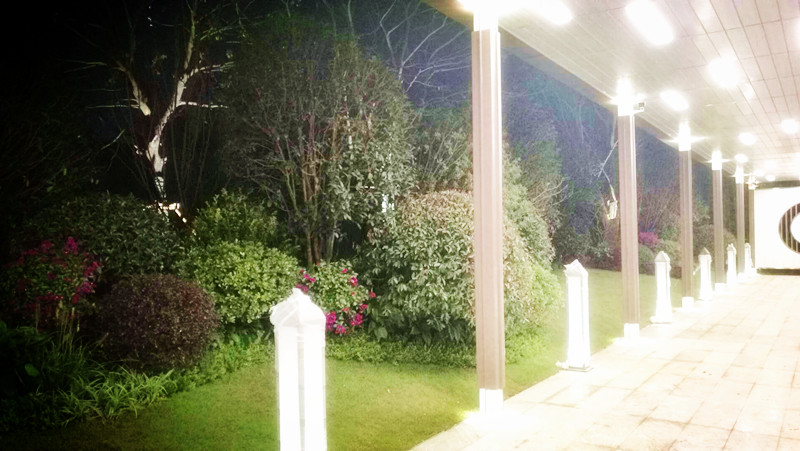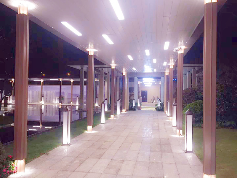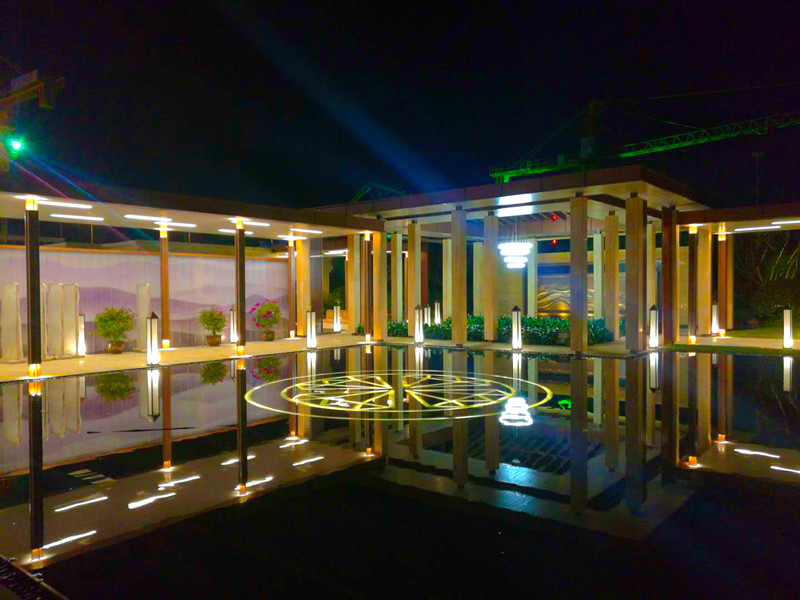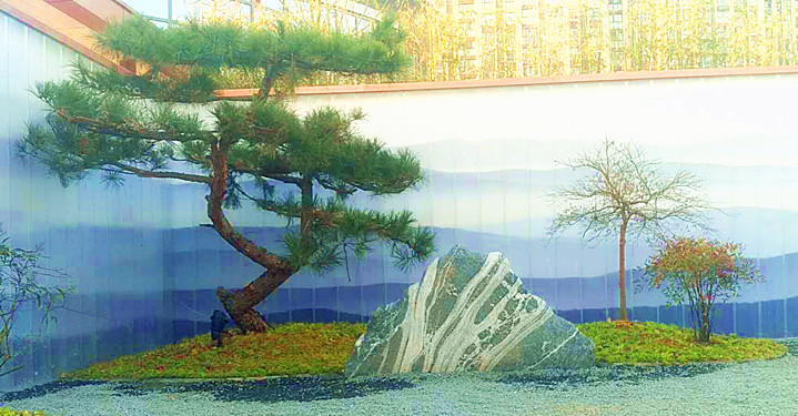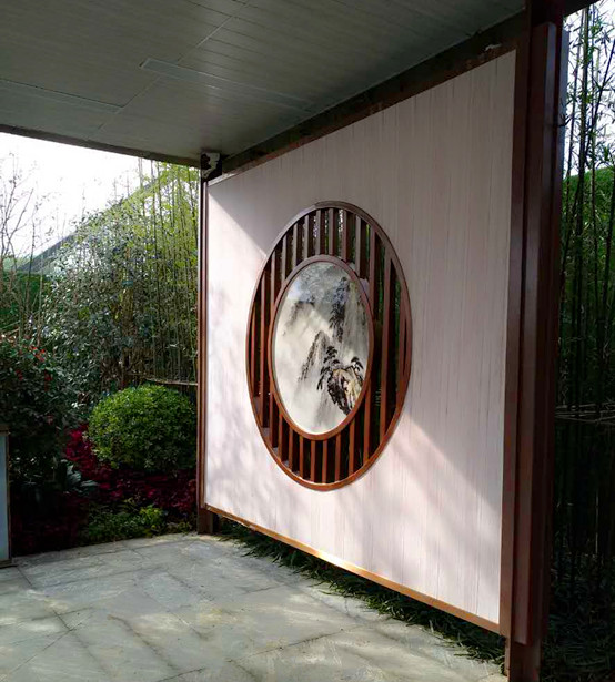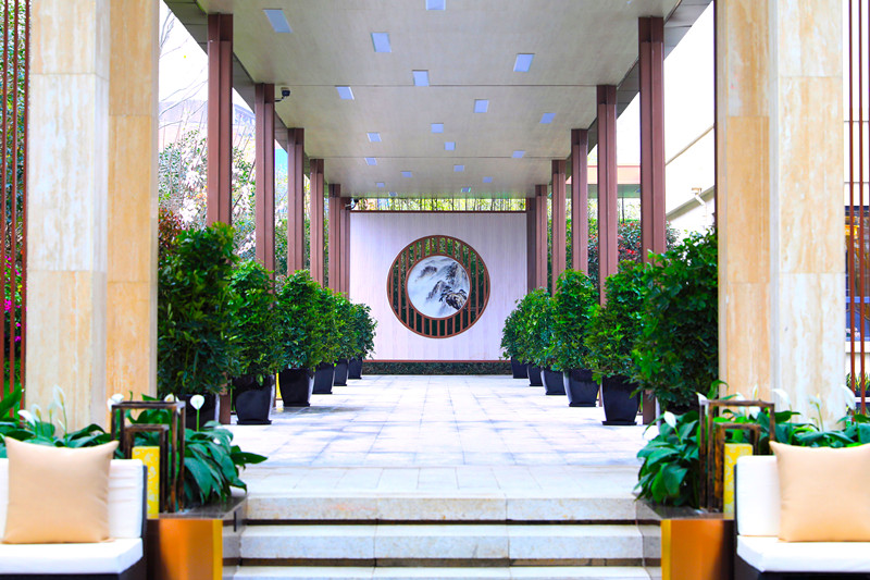 廊道的盡頭,一幅山水畫的屏風,與四周的苗木相映成趣,在燈光的映射下,更加的明亮清爽!