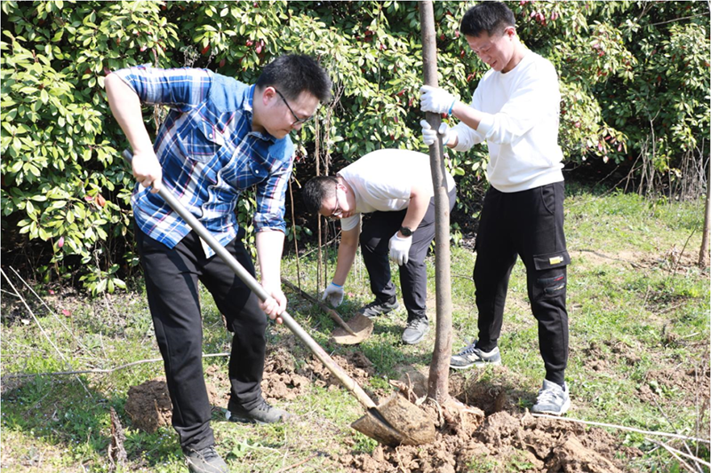 植一株綠色,溢一片春光。格林生態(tài)總部員工一大早就集合在苗圃,他們希望通過此次植樹活動為苗圃增添“綠色新衣”。在專業(yè)人員的指導(dǎo)下,大家揮鍬鏟土、扶樹正苗、澆水培土,栽下一棵棵樹苗。三五人一組,分工合作、默契配合,男生挖坑、鏟土,女生扶苗,填埋,到處都是勤勞忙碌的身影。