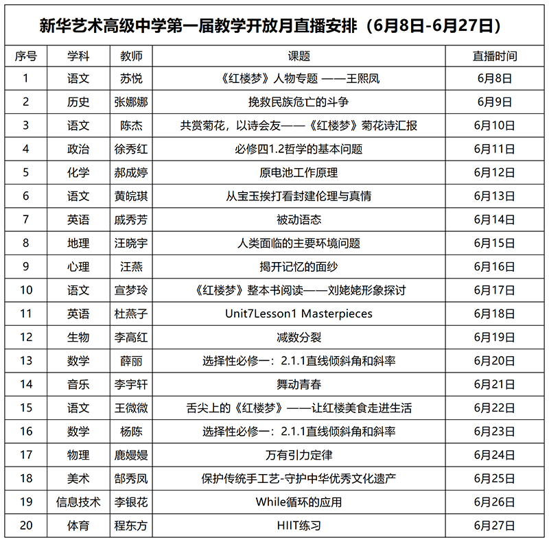 新華藝術(shù)高級(jí)中學(xué)第一屆教學(xué)開(kāi)放月得到校領(lǐng)導(dǎo)的高度重視,活動(dòng)跨時(shí)近四個(gè)月,共分為三個(gè)階段: