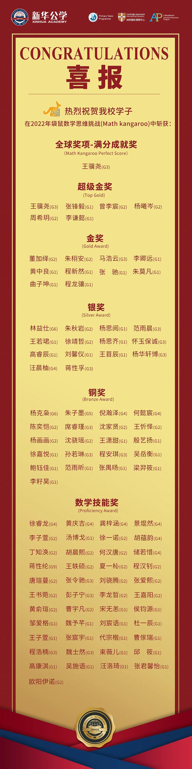 最后,再次祝賀所有獲獎同學與參賽同學!對數學的興趣只是起點,而在自己感興趣的領域深入鉆研、甚至選擇了高出自身年級的難度等級來挑戰(zhàn)自己,這樣的自信力與勇氣更為可貴!我們希望參賽的每一位新華學子,都能因這樣亮眼的成績而獲得成就感,在以后的學習中充滿動力、再創(chuàng)佳績!