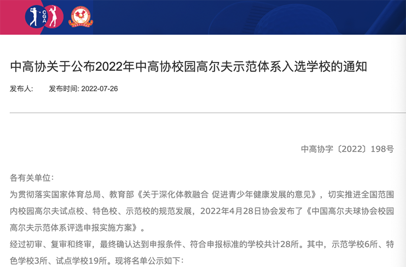 據(jù)中國高爾夫球協(xié)會2022年7月26日在官網(wǎng)公布的中高協(xié)字〔2022〕198號文件所示:合肥新華公學成為2022年全國“校園高爾夫”試點學校,同時也是安徽唯一一所試點學校。