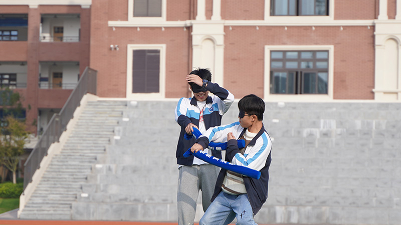 蒙住雙眼,靠聽覺去發現對方位置,模仿俠客用長條氣球刺敲打對方,也要注意分辨外界干擾,歡聲笑語在操場飄蕩,幫助同學們釋放學習壓力。