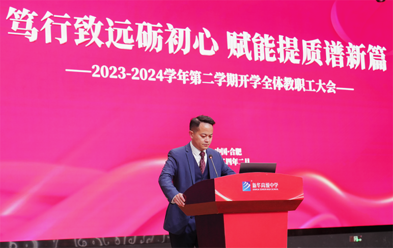 時序更替,華章日新。為進一步凝聚共識,統一思想,全力做好新學期各項準備工作,2月19日上午,我校在文體中心報告廳召開新學期全體教職工大會,會議由新華高級中學黨政辦公室主任夏娟娟主持。全體教職工以龍騰虎躍的精神面貌,充沛飽滿的工作熱情齊聚一堂參加會議。